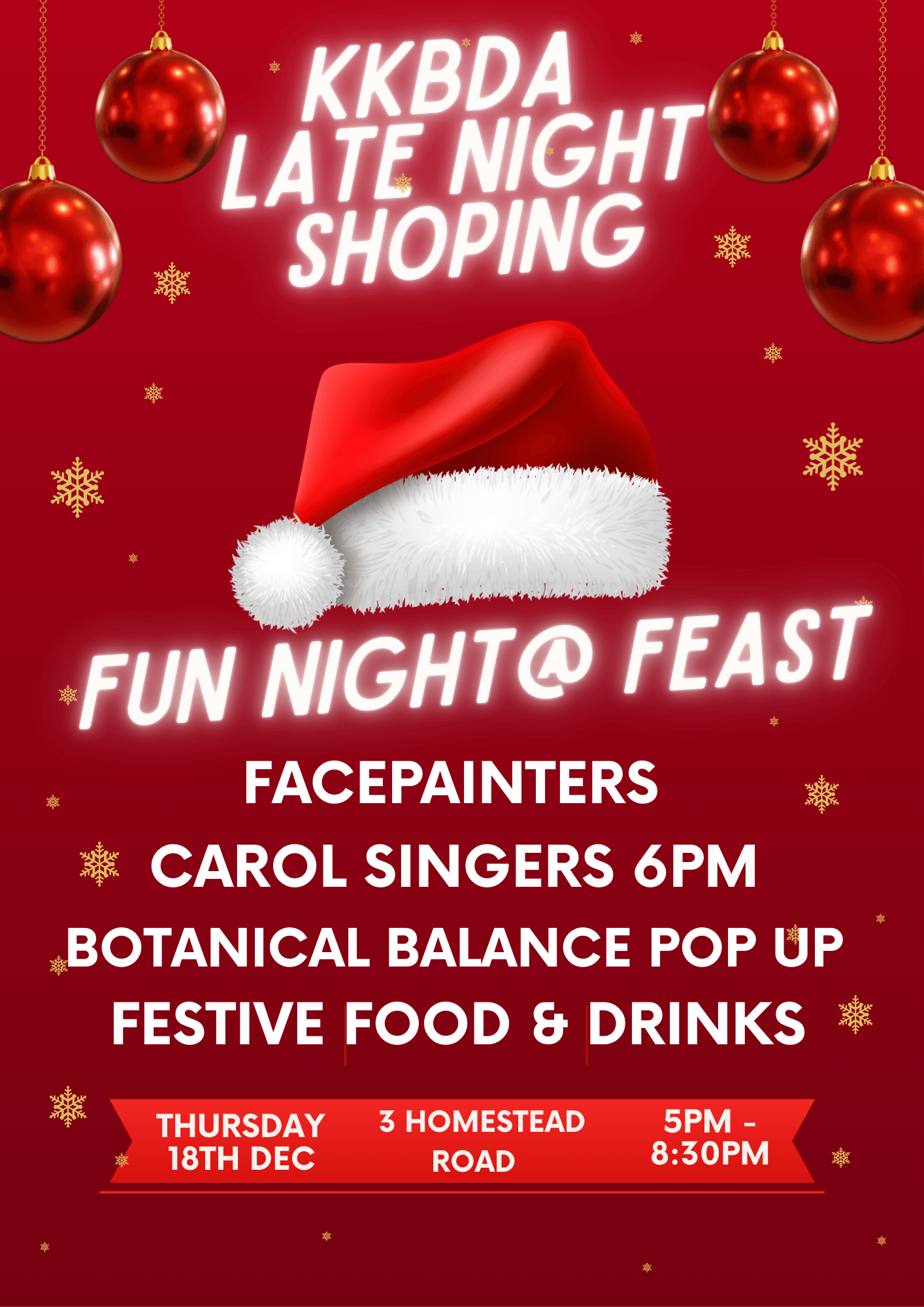 Join us for some Christmas Carol Singers, face painters, dinner, drinks or snacks as part of the KKBDA late night shopping event Thursday 18th December.
