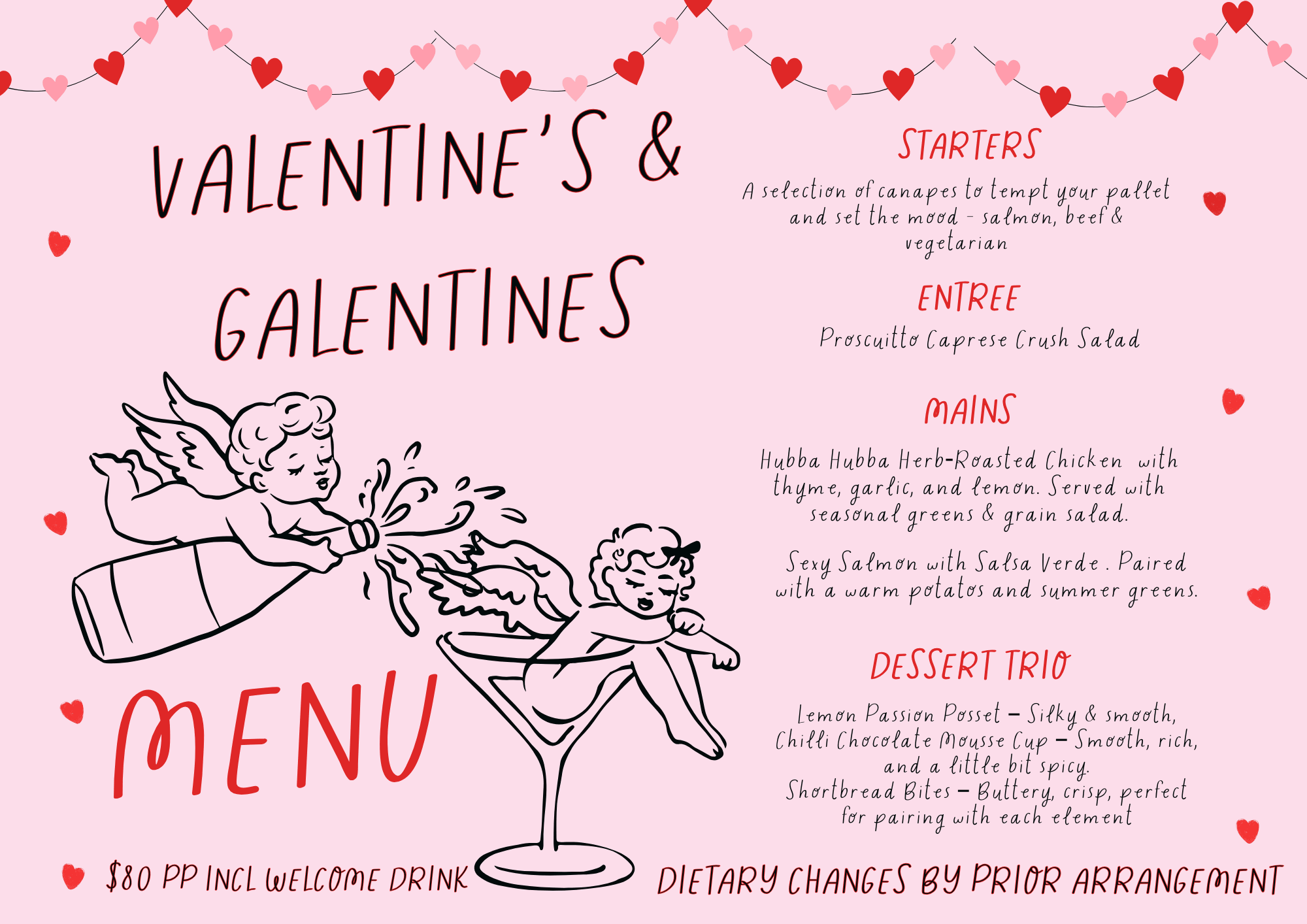 Sat 14th Feb from 6pm - join us for a fun relaxed night of eating, drinking and dancing. Bookings essential. $80 pp includes a welcome drink.
